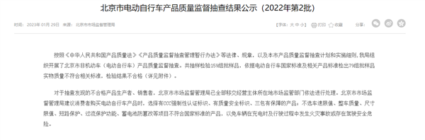 新日登北京电动自行车不合格“黑榜”:多批电池管理系统有问题?电动自行车早已成为不少人上班、买菜、送娃上学的出行代步神器,与此同时,车辆安全问题也逐渐被大家重视起来,如电池、车辆质量等。日前,北京市市场监督管理局公布《北京市电动自行车产品质量监督抽查结果公示》(2022年第2批),对北京市非机动车(电动自行车)产品质量监督抽查。此次抽查共