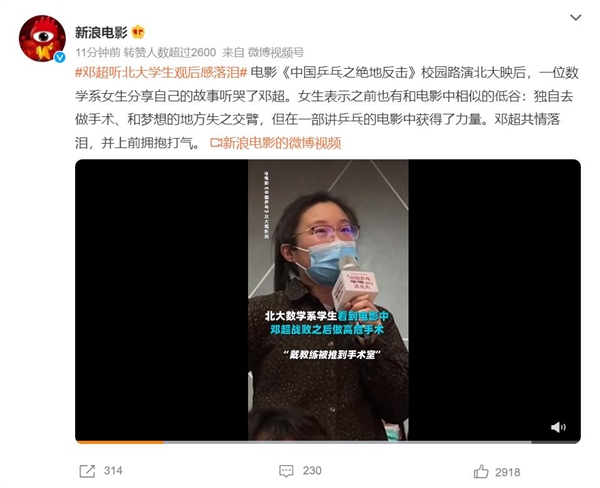 电影《中国乒乓之绝地反击》明天上映:邓超听北大学生观后感落泪?今日消息,电影《中国乒乓之绝地反击》宣布将于2月17日大规模上映。据媒体报道,在电影《中国乒乓之绝地反击》校园路演北大映后,一位数学系女生分享自己的故事听哭了邓超。女生表示之前也有和电影中相似的低谷:独自去做手术、和梦想的地方失之交臂,但在一部讲乒乓的电影中获得了力量。邓超