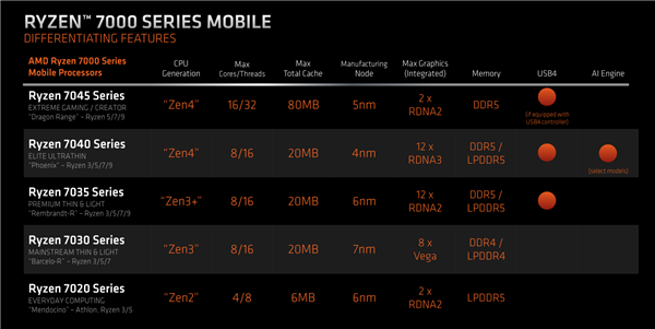 AMD锐龙7000送上史上最强核显!频率3GHz 超越所有独显?AMD今天正式发布了锐龙7000系列移动版处理器,包含多个系列:5nm、Zen4、RDNA2的锐龙7045HX系列;4nm、Zen4、RDNA3的锐龙7040HS系列;6nm、Zen3 、RDNA2的锐龙7035U系列;7nm、Zen3、Vega的锐龙7030U系列;6nm、Zen2、RDNA2的锐龙 速龙7020系列。其中,锐龙7040HS系列无疑是技术上最先进的,直接用上了刚刚诞生的